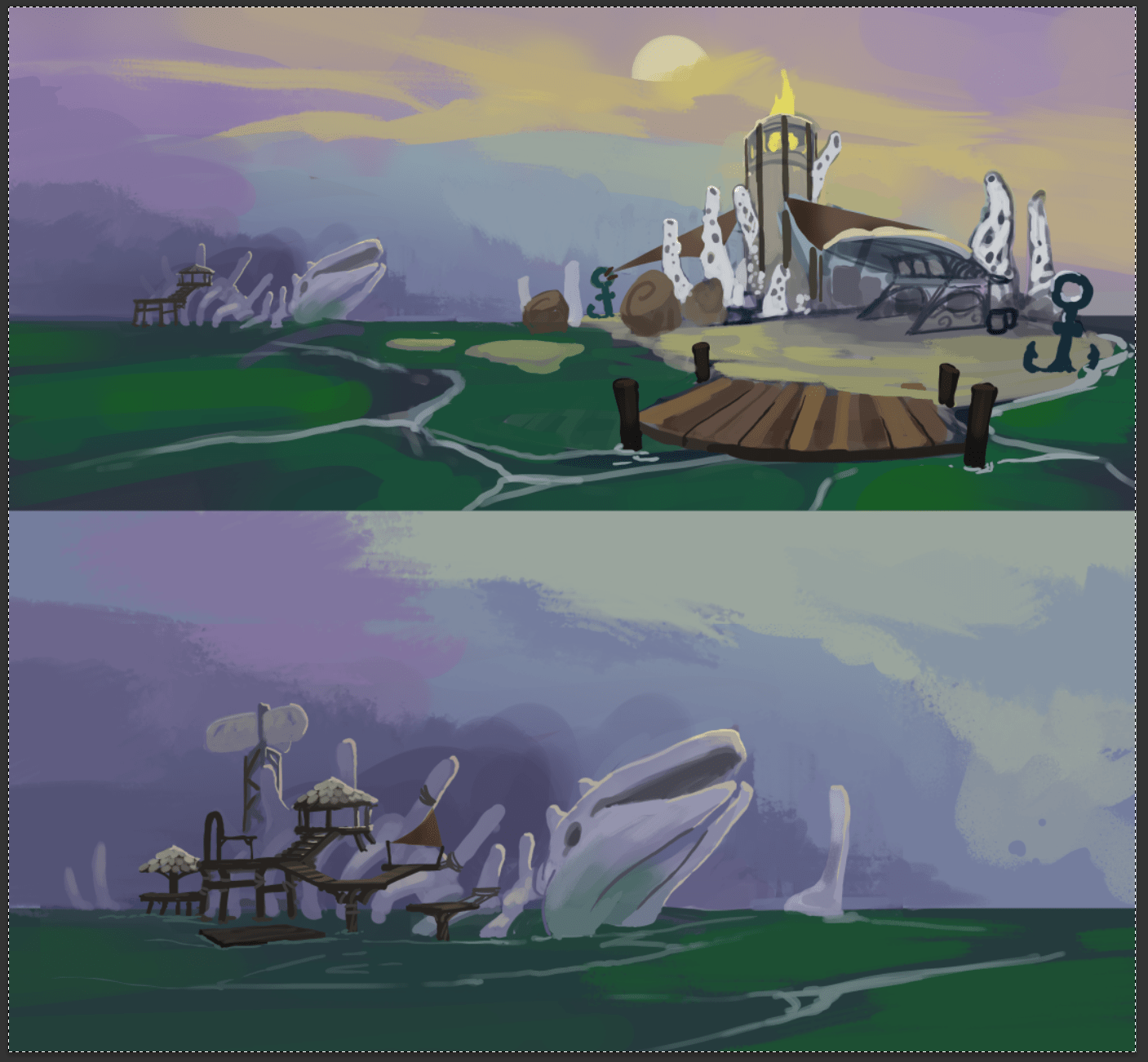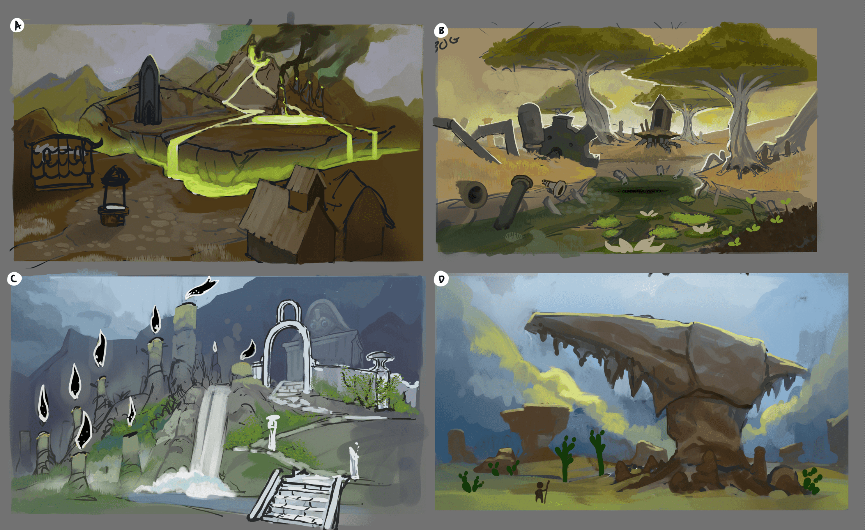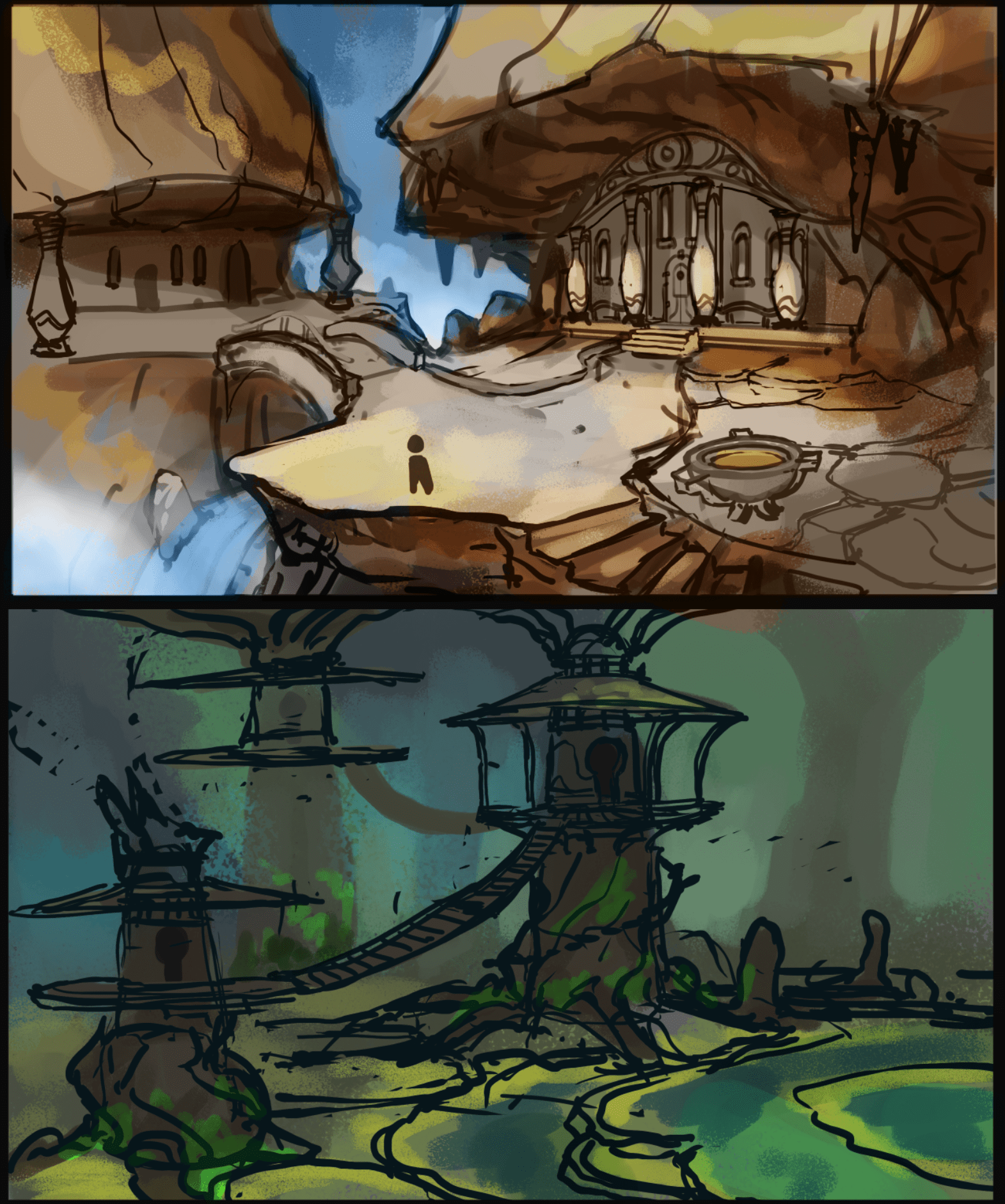 Environment sketches for an unreleased project. These are quick iterations between myself and the design time to help visualize their ideas. All sketches shared with permission.