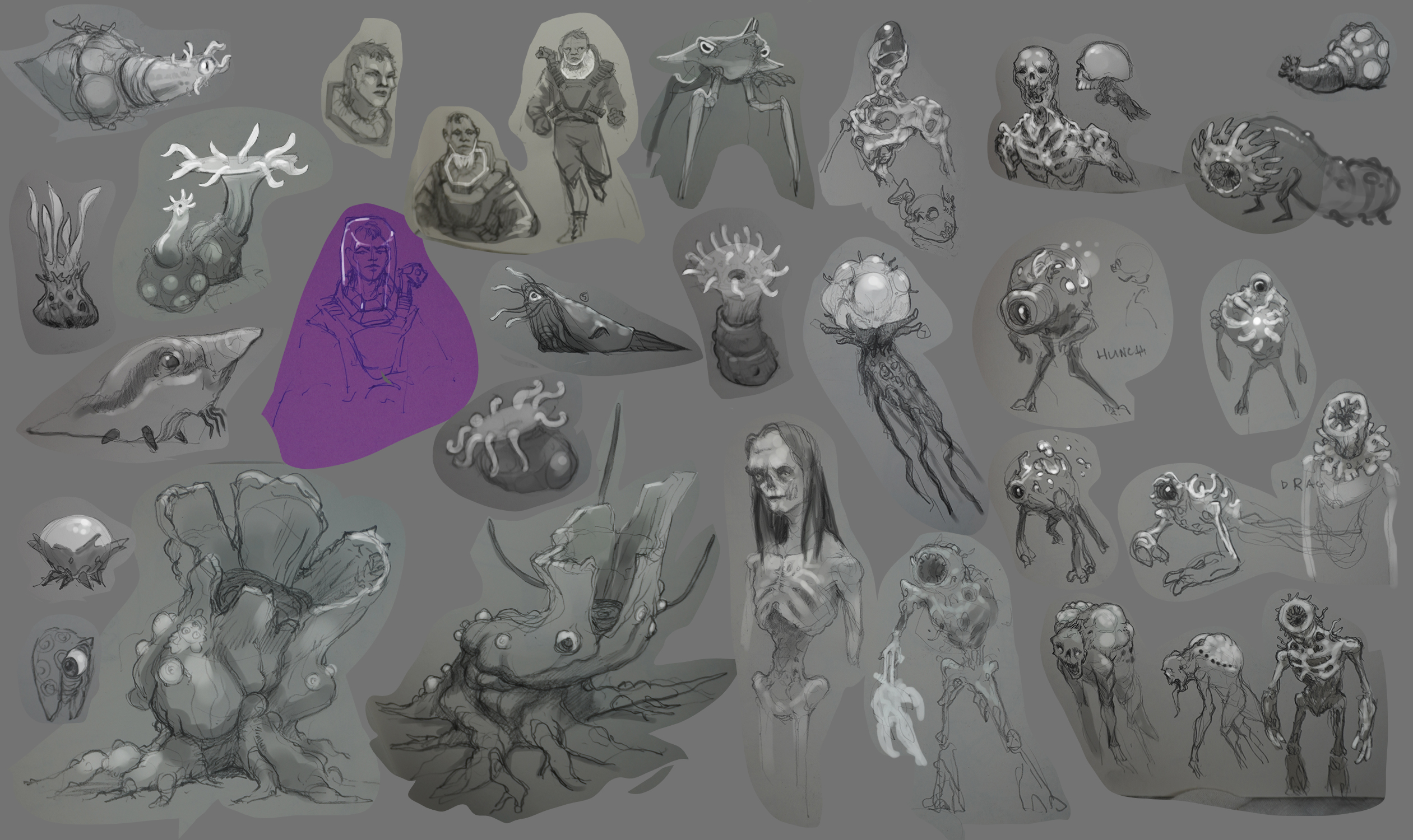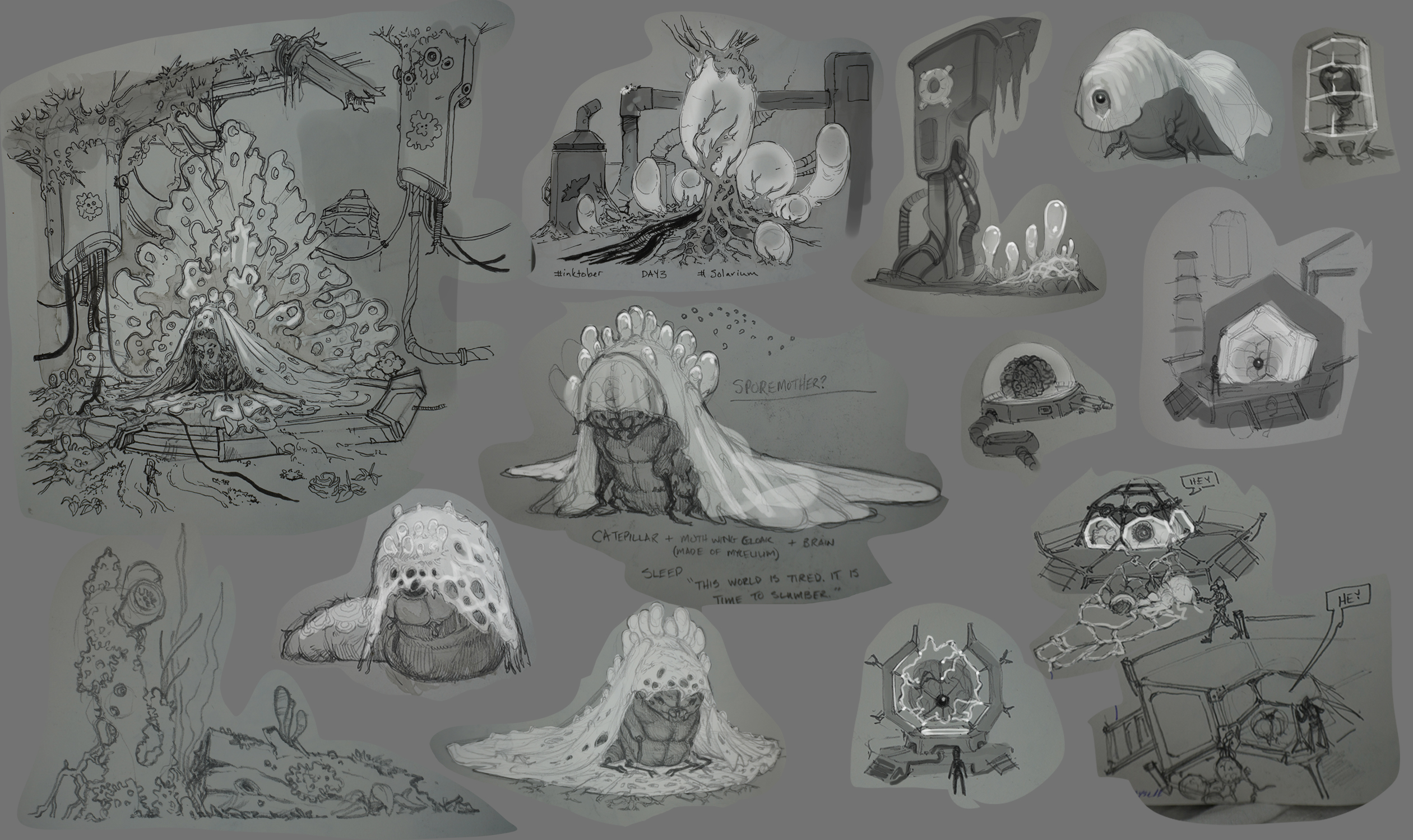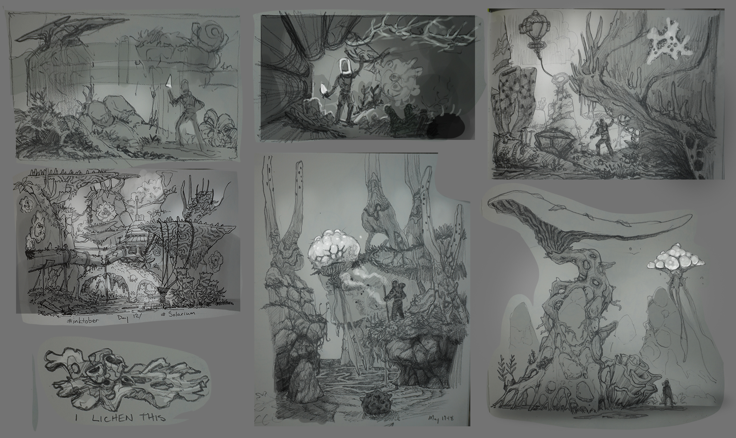 Cleaned up pages of exploration sketches from my person project SOLARIUM. I’ve done a lot of exploration and thinking for shape language, story beats, flora, fauna, and mood in my sketchbook that I wanted to share. I still have a lot to plan out, but I hope that you enjoy.